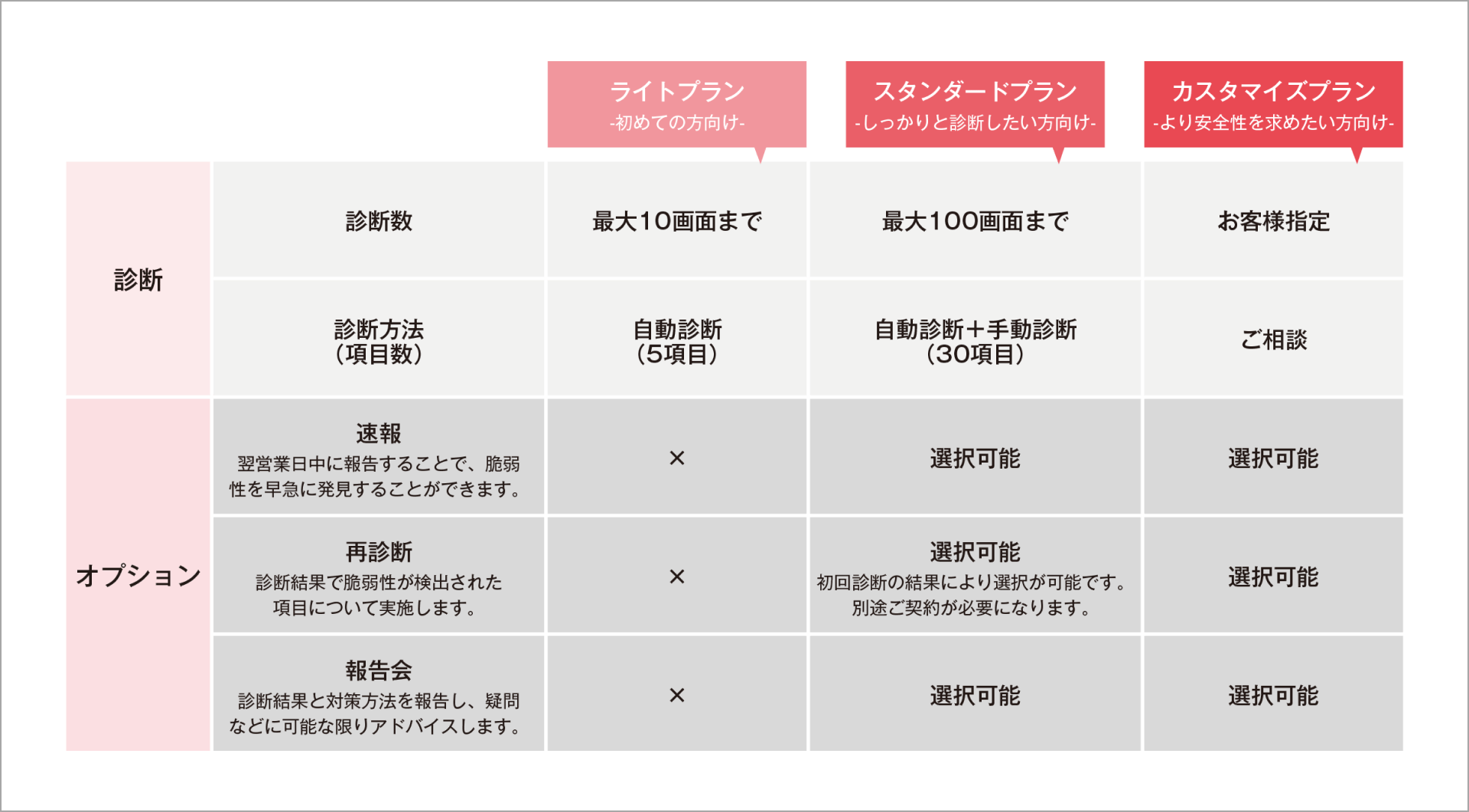 自動診断・手動診断の2種類の診断方法で、網羅的な診断を実施します。3つのプランから、幅広いお客様に対応が可能です。