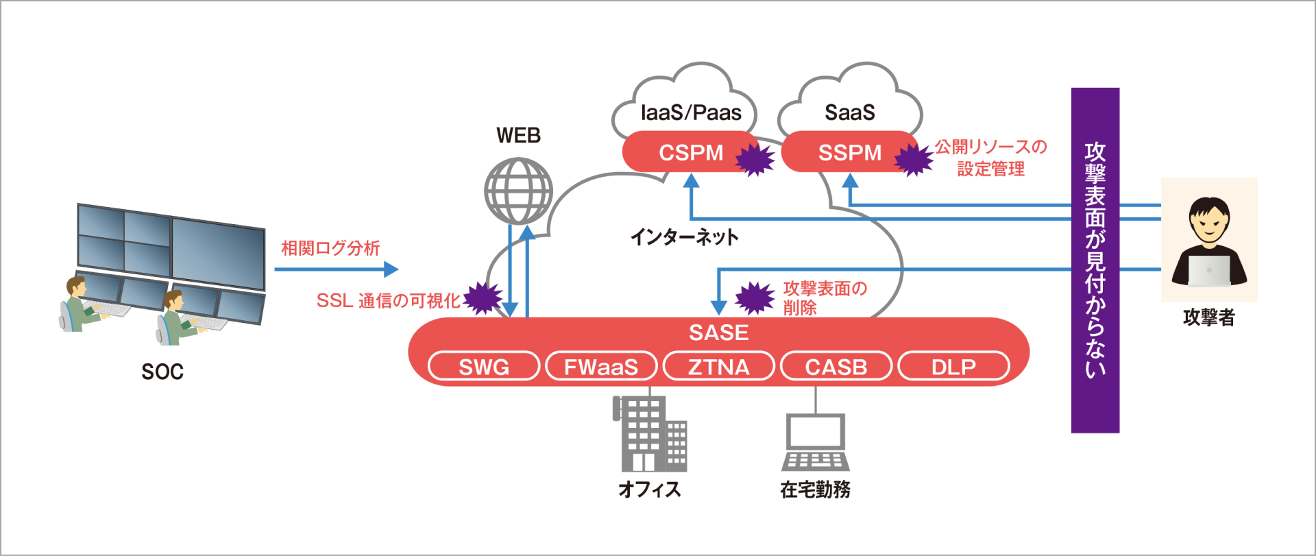 「SASEとCNAPPを導入することでサイバー攻撃を行おうとする側から“攻撃表面”を見えなくすることができます(図参照)。特にクラウドをお使いのお客様にはSASEとCNAPPの組み合わせがゼロトラスト実現への第一歩としてお勧めできます」(小島氏)