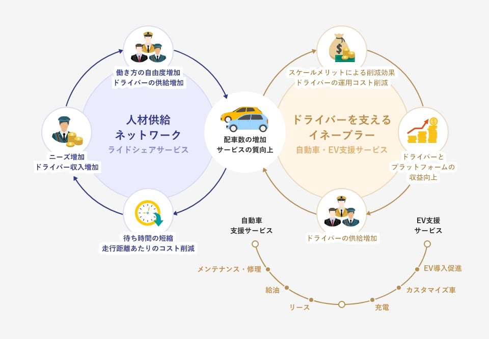ライドシェアサービスを例にとると、シェアリングエコノミーとの関連で注目されるのは、たいてい左側の円である。ところが、このサイクルを回すためには、同時に、右側のイネーブラーのサイクルも回っていなければならない。それを回すのは、あくまで企業だ。