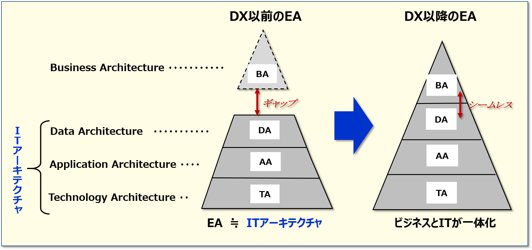 DX以前のEA(エンタープライズアーキテクチャ)は基幹系システムではほぼ確立したと言えます。しかし、企業活動全域では未だアナログ作業が多く存在しEAは混とんとした状態にありました。