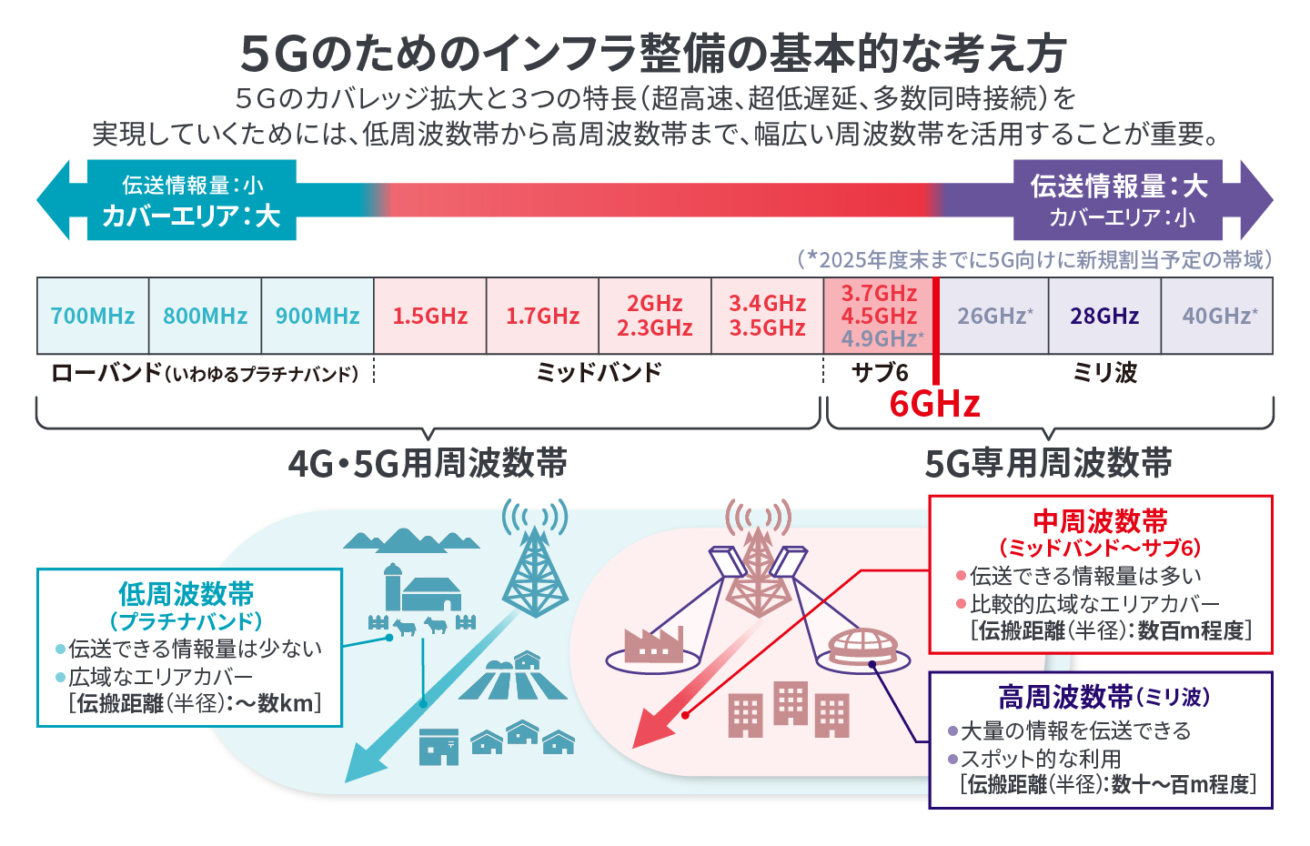 2024年5月、総務省は5Gのインフラ整備に関して、「低周波数帯から高周波数帯まで、幅広い周波数帯を活用することが重要」とし、「サブ6」の周波数帯を、2027年までに都市部の8割でカバーするという新たな目標を掲げました。