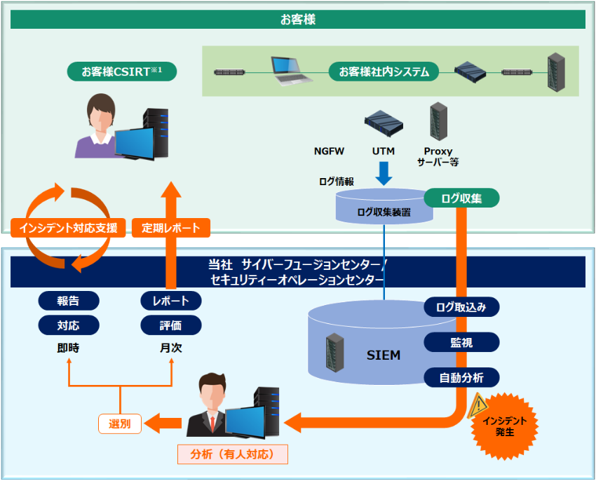 リモート環境からお客様のセキュリティー機器を24時間365日監視し、サイバー攻撃の検知とその対応策をアドバイスする専門組織