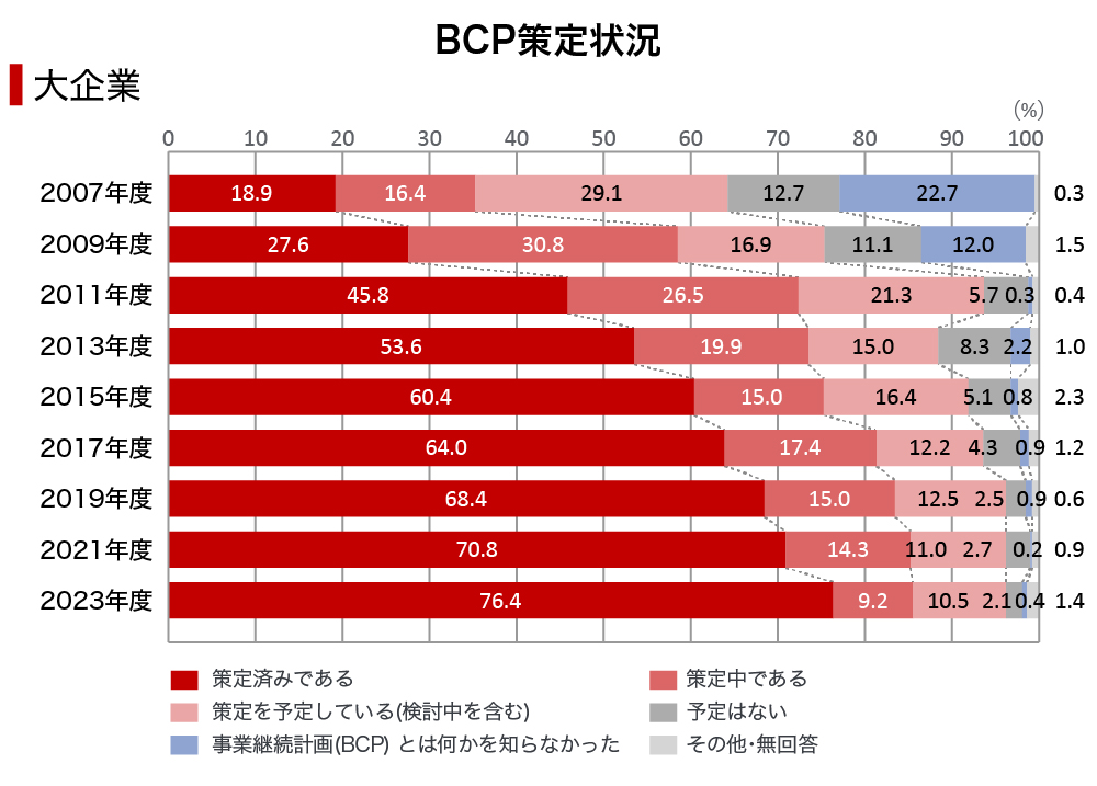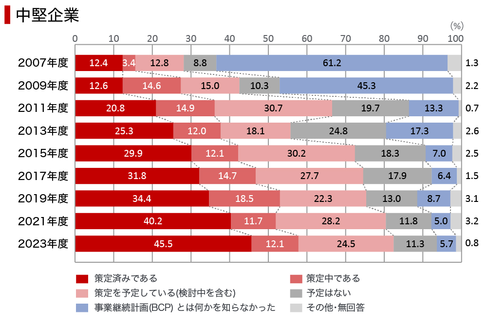 なお、2024年時点のBCP策定状況は、大企業では76.4%が「策定済み」、9.2%が「策定中」と回答し、実施率は8割を超えました。中堅企業では45.5%が「策定済み」、12.1%が「策定中」と回答し、実施率は半数を超えています。