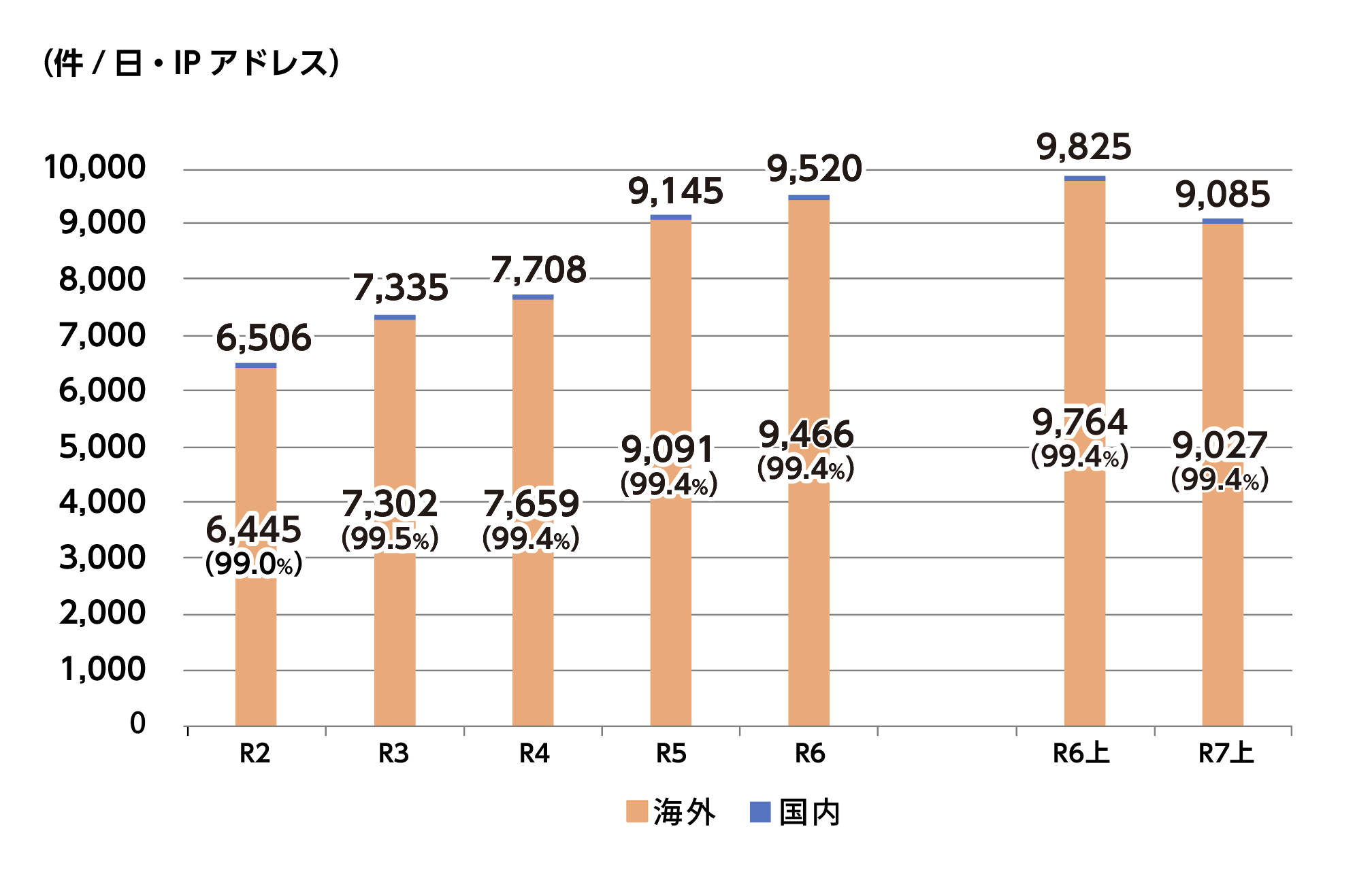 - 脆弱性探索行為などの不審なアクセス件数が高水準で推移(送信元の大部分が海外)。