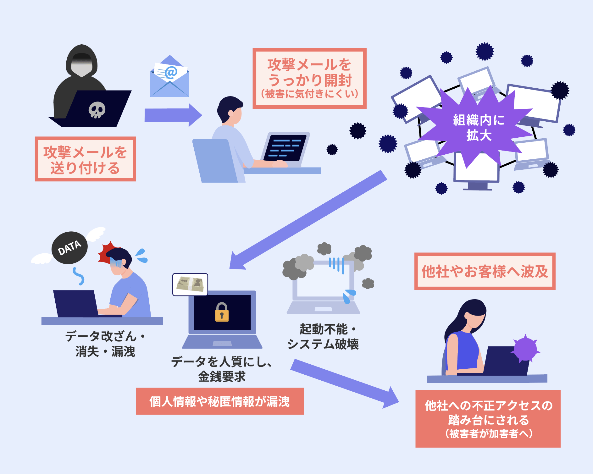 悪意のあるWebサイトにアクセスしたり、メールに添付されたファイルを開いたりすることで、マルウェアに感染するケースが多いです。その後、ネットワーク上の端末やサーバーへと被害が拡大するおそれがあります。