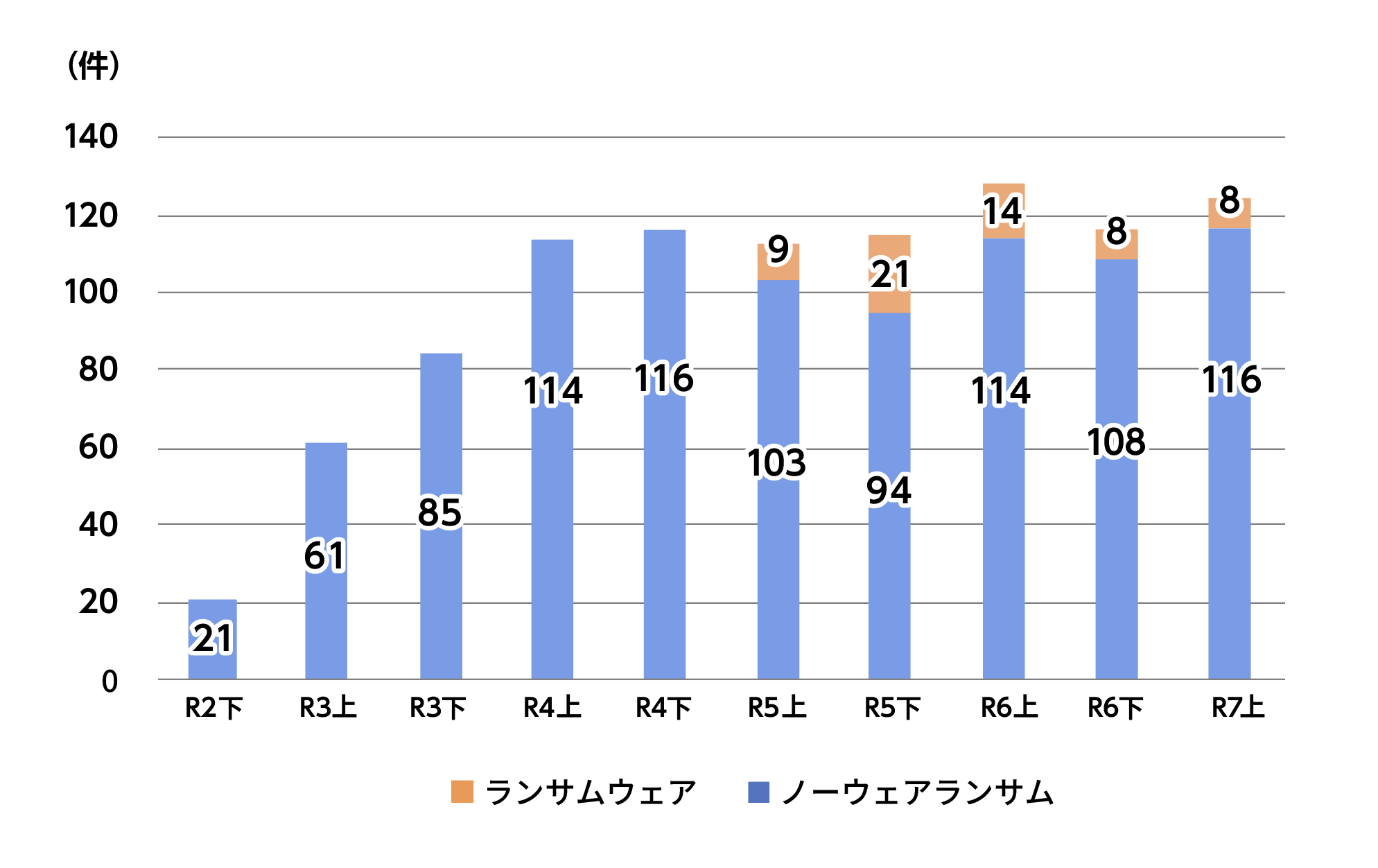 - 令和7年上半期におけるランサムウェアの被害報告件数は116件であり、令和4年下半期と並び最多。