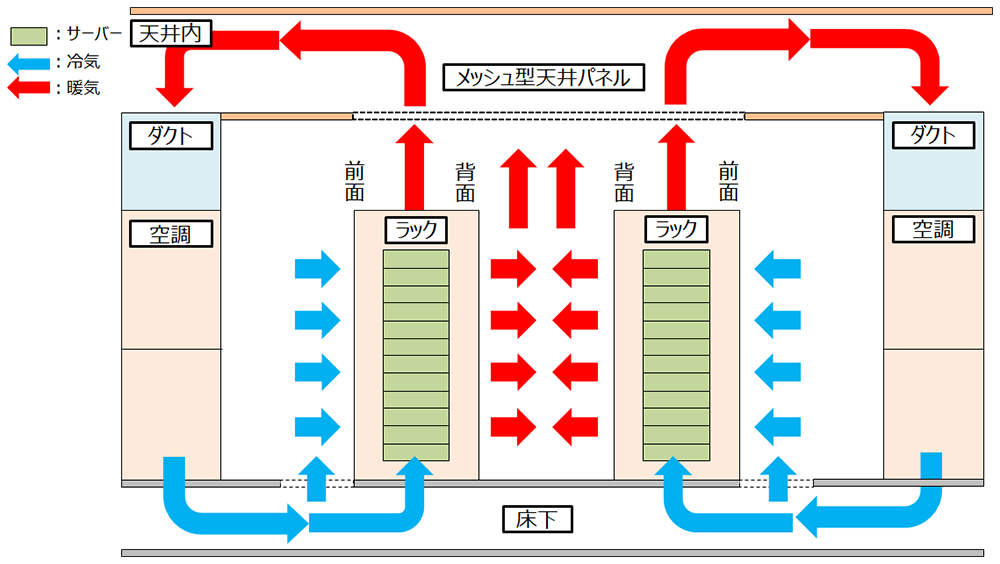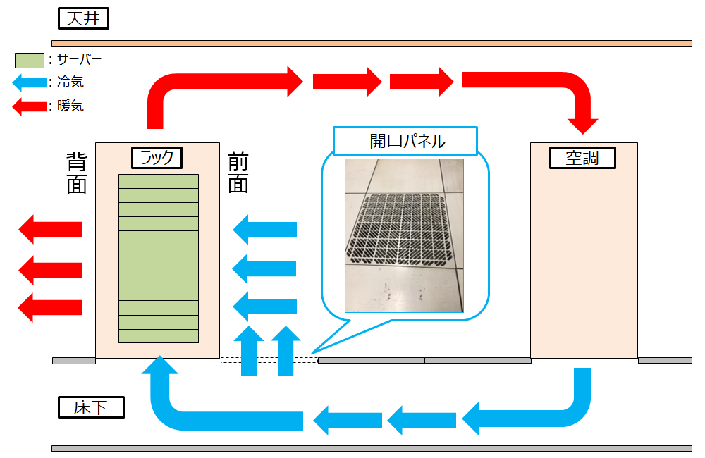 2000年代頃、データセンターの冷却技術で広く普及したのが二重床空調方式になります。床下に空調機から冷気を送り、ラック底面の開口部や開口パネルを利用しながら冷却します。ラックから排出された暖気は空調機に戻り、再度空調機から冷気を送ることで循環する仕組みです。この方式において難しい部分は「暖気を空調機に戻す」ことにあります。暖気が天井付近に滞留して熱だまりが発生してしまうケースも少なくないため、サーバー室の温度状況を日常的に監視し、時には天井にファンを設置するなど日々改善を図る必要があります。