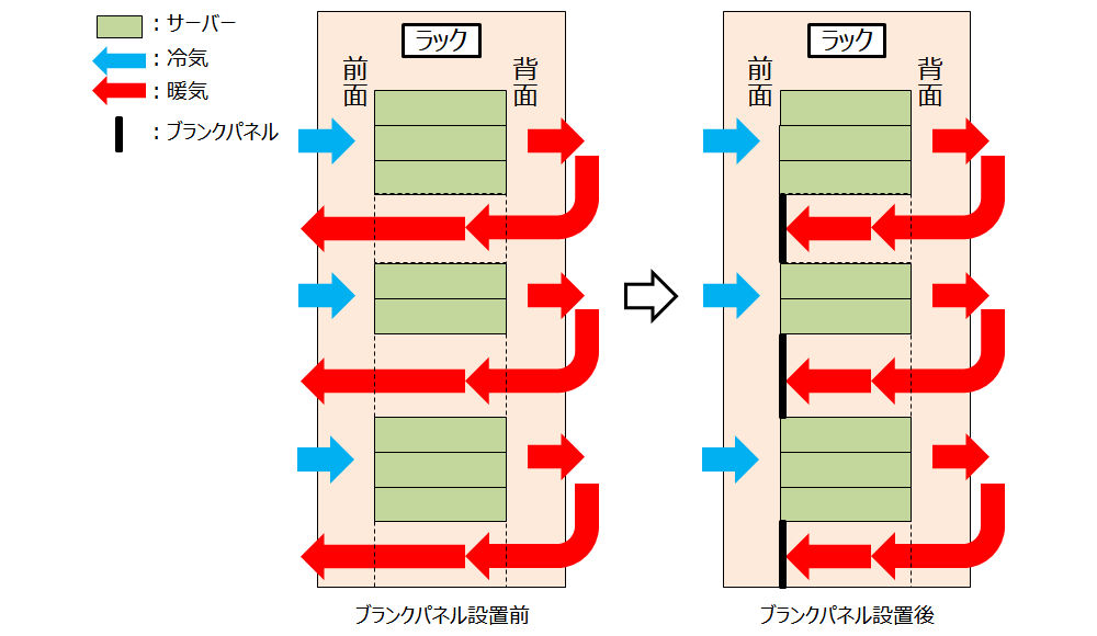 冷気と暖気が混ざり合ってしまい、冷却効率を落としてしまいます。そこで是非とも活用いただきたいのがブランクパネルです。ブランクパネルを前面側に取り付けることで排気の回り込みを防ぎます。ラック内でサーバーなどIT機器間に隙間がないか、機器未設置のスペースがないか点検を実施してみてください。隙間やスペースにブランクパネルを取り付けることにより暖気の回り込みを防ぎ、冷却効率を改善できます。