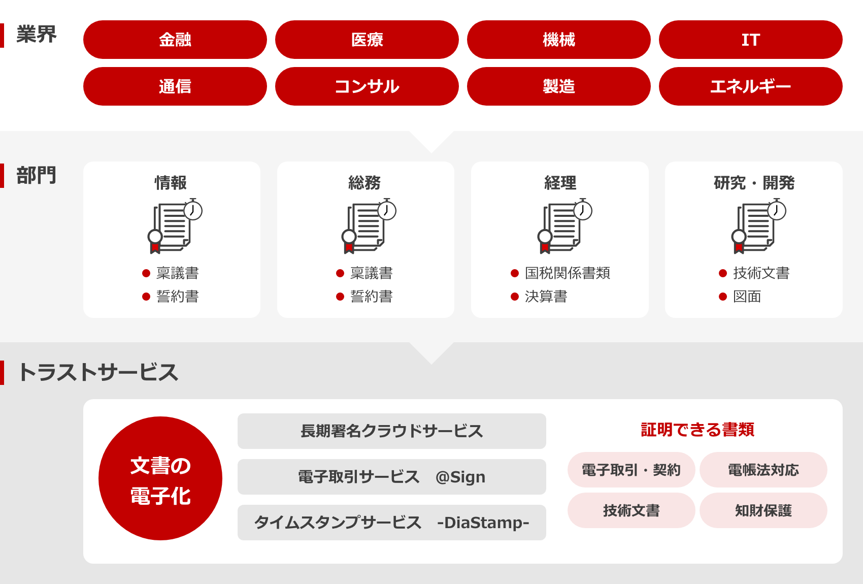 先使用権の立証に必要な証拠管理を行う場合、仕様書や製造記録など、大量の電子データを効率よく証拠化する手段が必要です。そこで有効なのが、タイムスタンプや電子署名を活用したトラストサービスです。