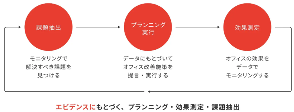 また、単なるデータ分析にとどまらず、改善提案までを一貫して伴走。オフィスを単なるコストから経営資源へと転換することで、その価値の最大化をご支援します。
