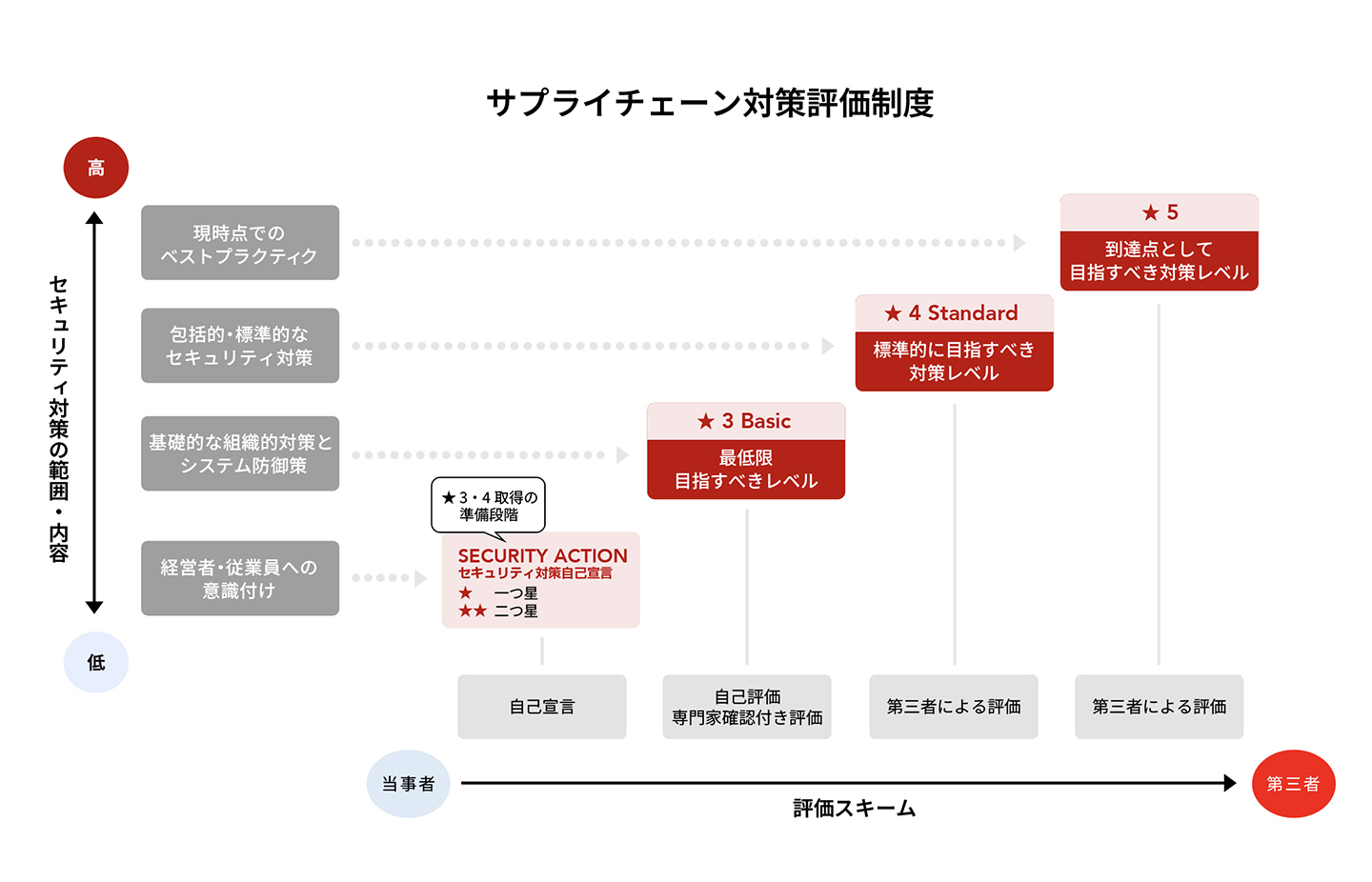 サプライチェーン対策評価制度では企業のセキュリティー対策を★1〜★5で評価します。