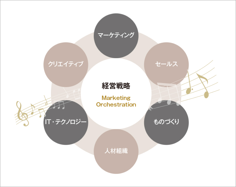 マーケティング・オーケストレーションは、1980年代にアメリカで注目され始めた経営戦略です。社内の研究・開発、設計、生産技術部門から、ブランディング、デマンドジェネレーション、セールス、販売代理店のマネジメント、さらには海外の現地法人部門に至るまで、すべての関係者がマーケティングとセールス活動を全体最適の観点で調和させることで、まるでオーケストラがシンフォニーを奏でるようにマーケティングを実行することを指します。従来のマーケティングは、一部のマーケターに依存することが多く、それが部分最適化を招いてきました。これらを是正する概念として誕生したのがマーケティング・オーケストレーションです。