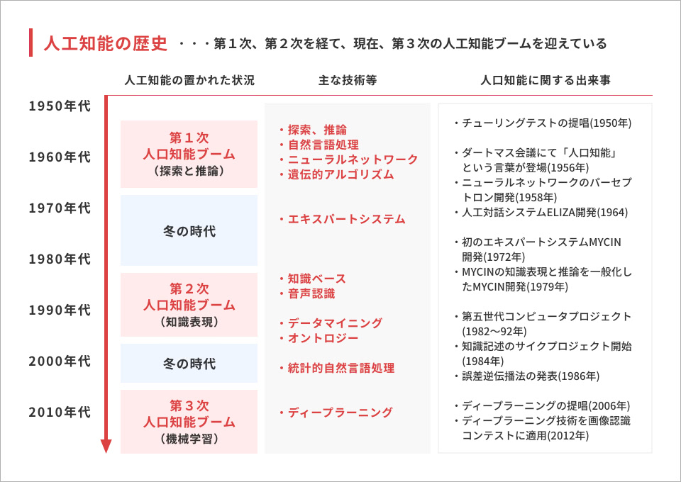 ただし、AIが注目を集めたのは、今回が初めてではありません。AIにはこれまで、1960年代の「第1次ブーム」、1990年代の「第2次ブーム」、2010年代の「第3次ブーム」という3回のブームがありました。