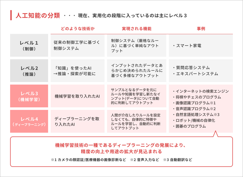 レベル3になると、AIはサンプルデータと人間の設定したルールに基づいて知識を学習し、インプットデータを自動的に判断してアウトプットできるようになります。そしてレベル4では、人間がルールを設定しなくても、AIがサンプルデータから自律的にデータの特徴やルールを学習して、自動的にアウトプットできるようになるのです。ECサイトにおけるレコメンド機能やパーソナライズ機能などはレベル3の典型例であり、多くの画像認識技術はレベル4のAIによって実現されています。