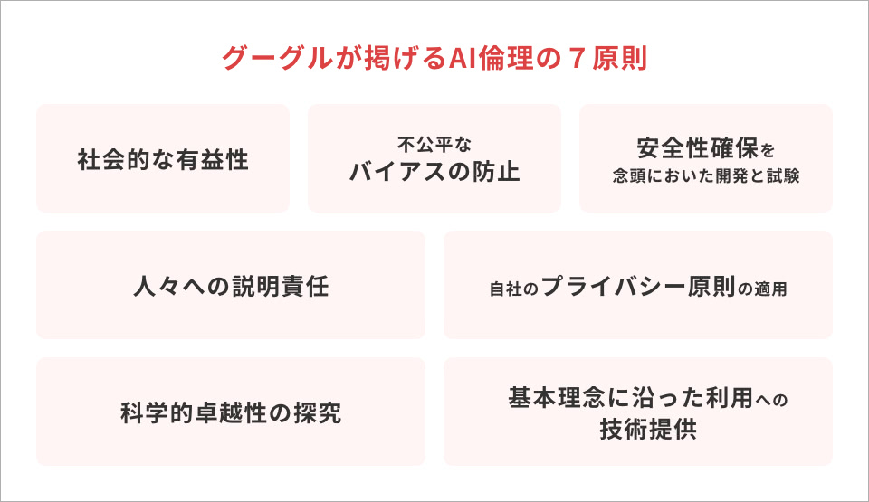 AIの可能性に注目が集まる一方で、AIを人類や人に害を引き起こす可能性のある技術へ利用すること、プライバシーや人権に反する目的に利用することに対する懸念もあります。こうしたAIが生む負の側面を無視できなくなりつつあるため、たとえばGoogleがAI倫理の7原則を示すなど、多くのIT企業は相次いでAI利用の指針を表明しています。日本政府もまた、AI利用の際の7原則を策定し、「人間中心」の考え方を掲げました。