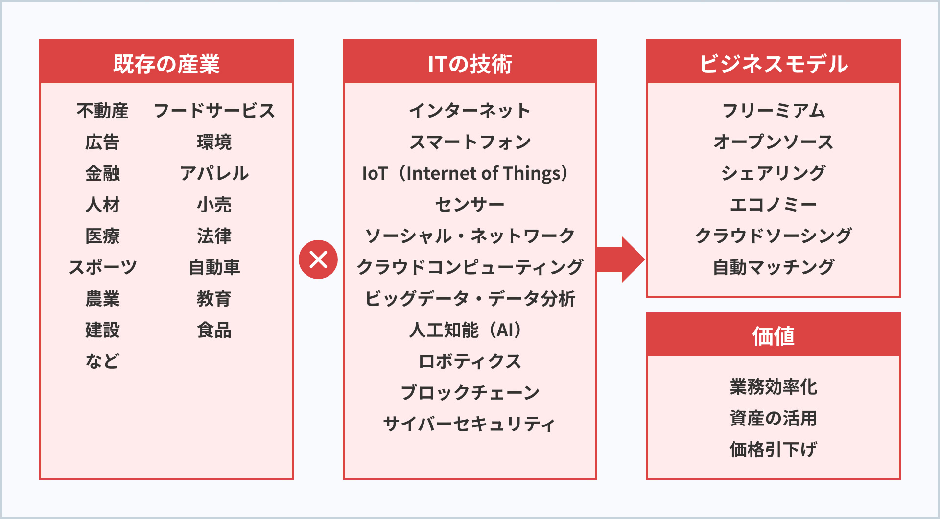 近年、X-Techのサービスが次々と生み出されるようになった背景には、「ITリソースの価格が下がり利用のハードルが下がった」「スマートフォンなどの普及で顧客接点を持ちやすくなった」「仮想化技術やクラウドコンピューティングの進化でデータ処理能力が向上した」ことなどがあります。ただし、本質的な顧客にとっての価値は、業務効率化や資産活用、価格引下げなどであることには変わりがありません。