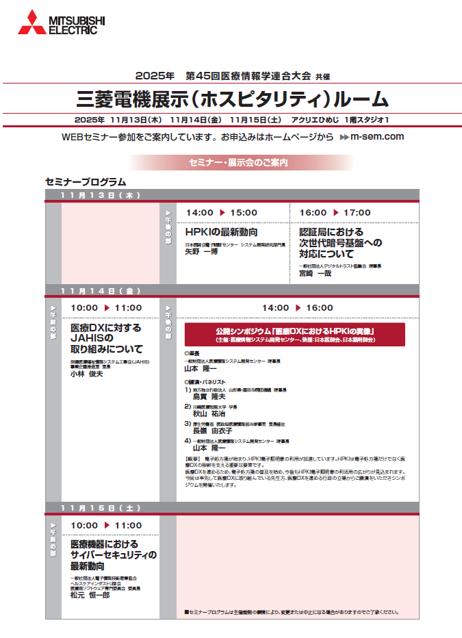 セミナー参加をご希望の方は、「2025年 第45回医療情報学連合大会 共催 三菱電機展示(ホスピタリティ)ルーム」より事前登録を行ってください。