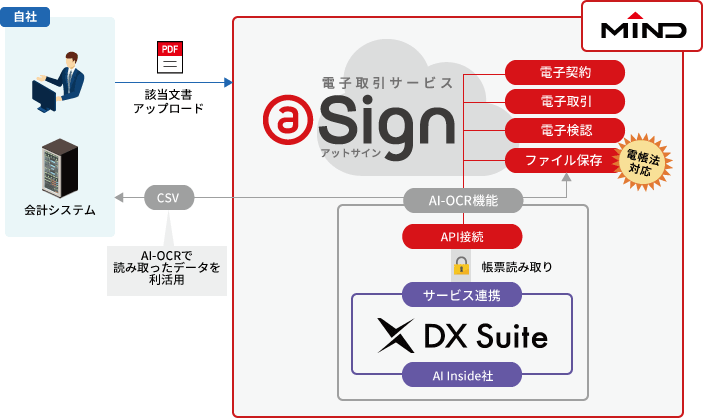 「AI-OCR機能」は、AI inside 株式会社が提供する「DX Suite」の文字認識APIを「電子取引サービス @Sign」のAI-OCRエンジンとして採用しサービス提供します。