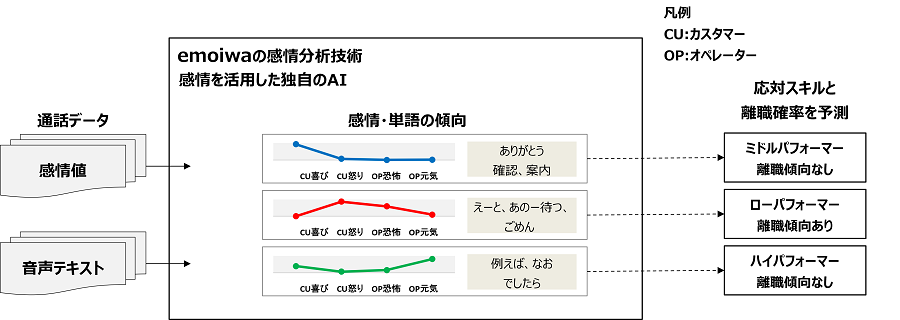 コンタクトセンターの録音データから得られる感情値を活用したオペレーターの退職確率と応対スキル予測を行うサービスです。