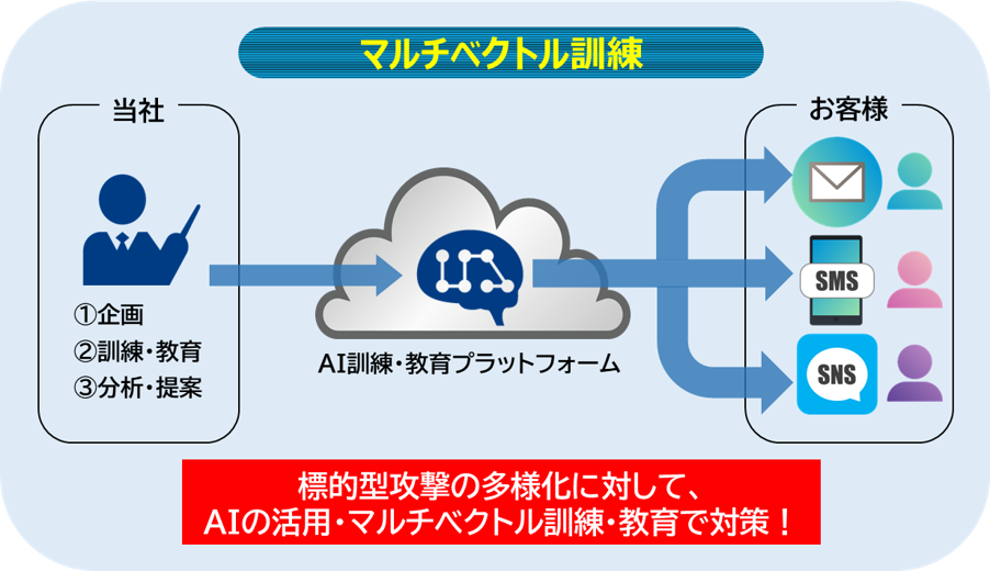 本サービスは、AIを活用した次世代型サイバーセキュリティー訓練プラットフォームを基盤として提供しており、年間を通じて訓練・教育をご利用いただくことで、継続的にお客様組織のセキュリティーリテラシーを向上させることが可能です。さらに、マルチベクトルに対応したことで、お客様組織の従業員は多様な攻撃手法に対する訓練を通じて警戒心を高め、迅速かつ適切に対応できるスキルを身につけることが可能です。