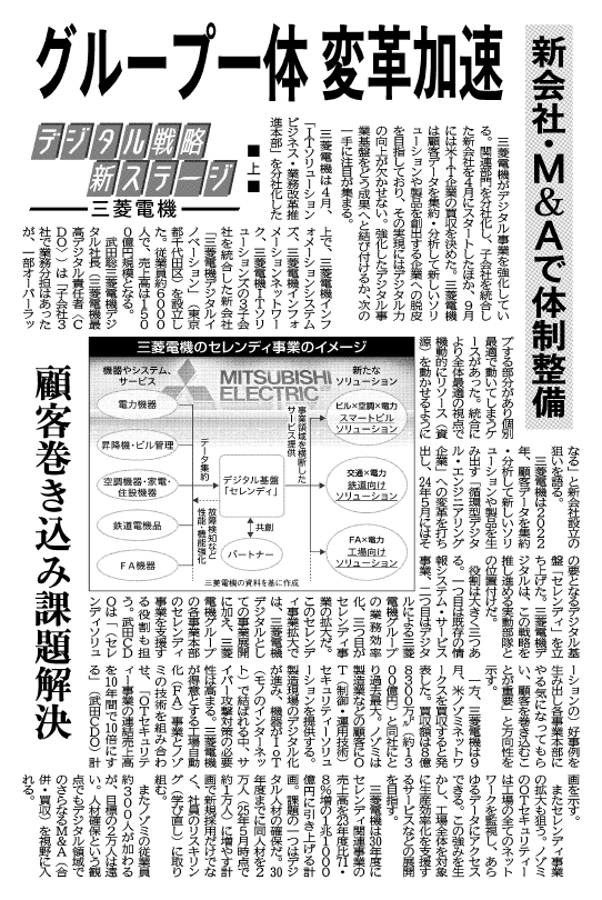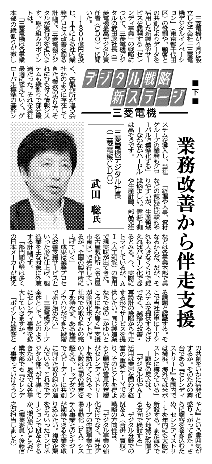 このたび、日刊工業新聞に当社代表取締役 取締役社長(兼 三菱電機株式会社 専務執行役)である 武田 聡のインタビュー記事が2日連続で掲載されましたのでお知らせいたします。