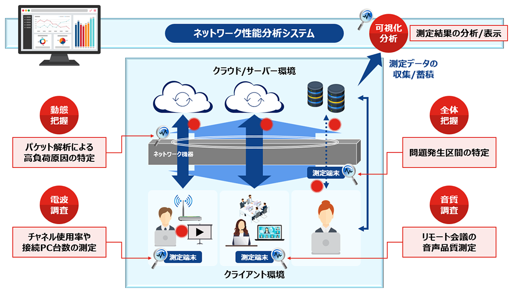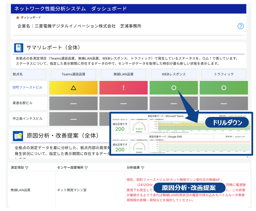 本システムは、ネットワーク利用者からの「何となく遅い」といった体感品質まで可視化・分析し、当社独自の分析機能で問題発生時の改善方法をダッシュボード上で確認できます。