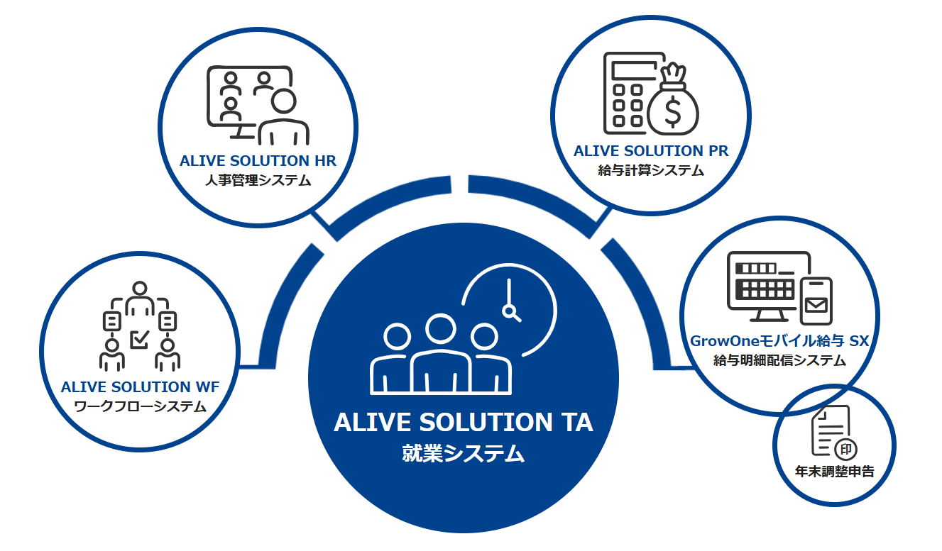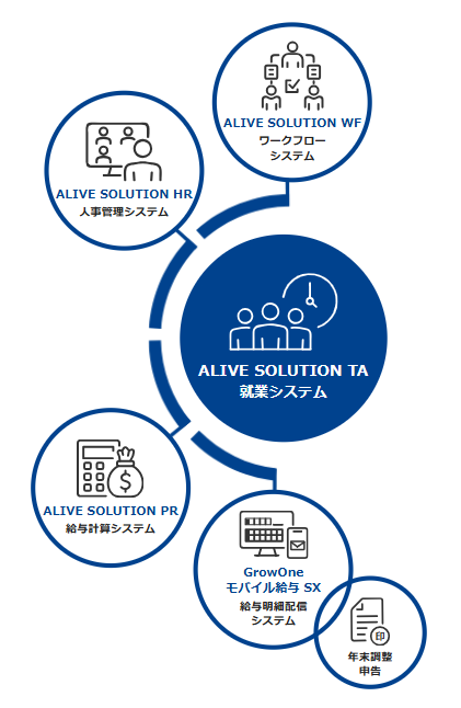 人事・給与・就業・ワークフローなどすべてのシステムがシームレスに連携することで、業務効率化、会社に求められる労働基準法などの法令遵守をサポートし、経営者が求める人事・総務部門の戦略企画を支援するソリューションです。