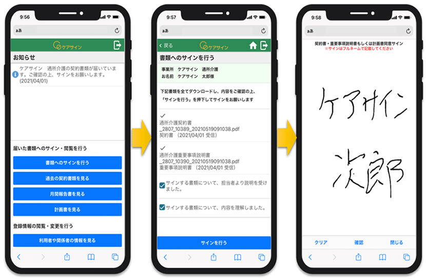契約書への住所や氏名などの手書き記入・捺印に代わり、電子サインのみとなります。利用者様・ご家族の負担が軽減されます。メール配信で遠隔地から電子サインもできます。