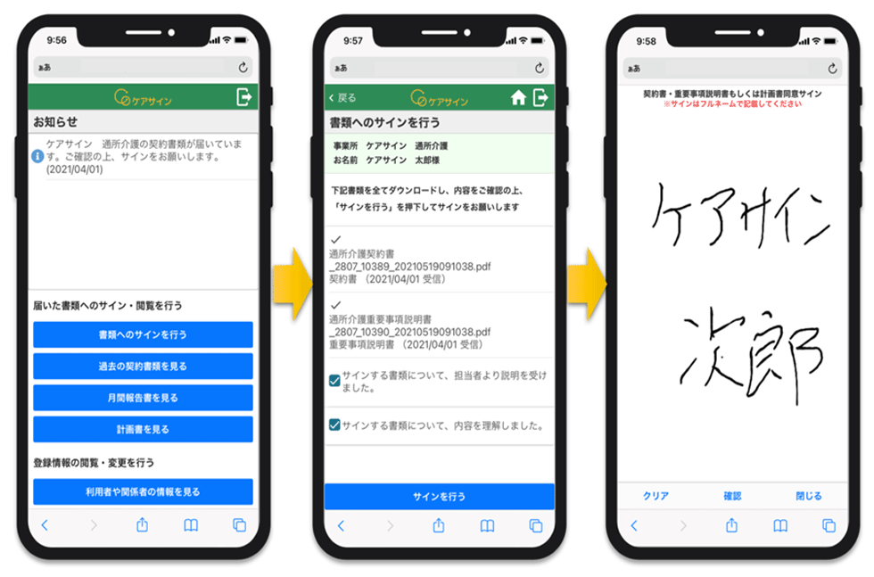 電子サインの導入により、利用者様のご家族様が遠方にいても、電子サインにてやりとりを行うことが可能です。