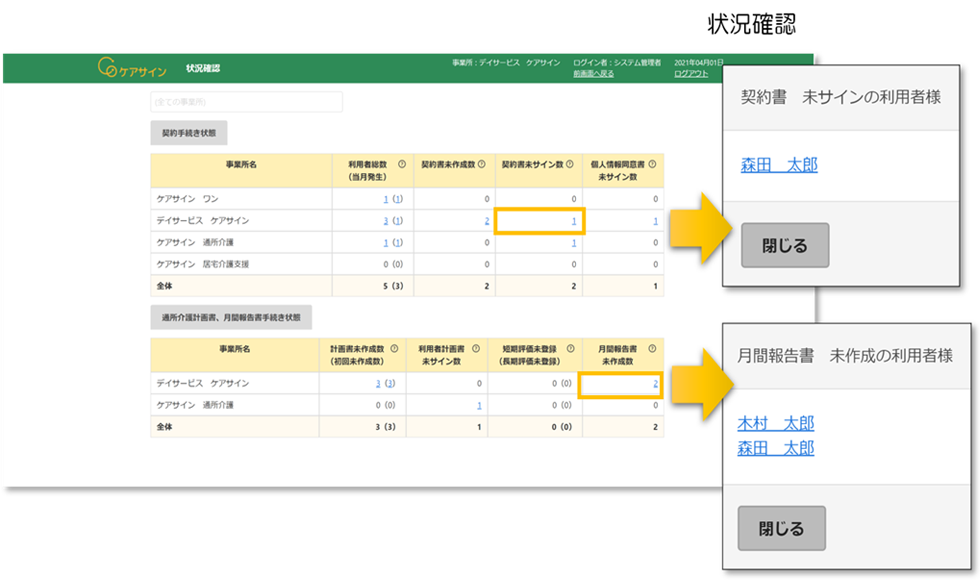 契約手続きや計画書、報告書に関する進捗状況が一目で確認できます。進捗状況を共有することで急な担当者不在が生じた場合でも、迅速に対応できます。
