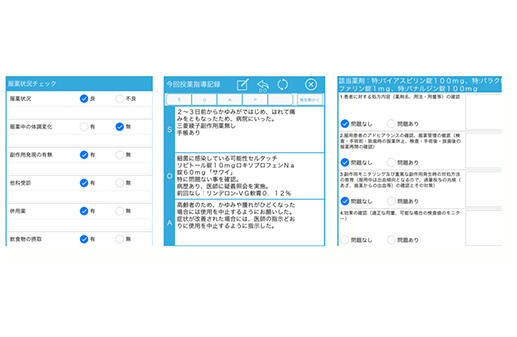 服薬指導の記録もその場で入力・そのまま連動します。服薬状況のチェックや特定薬剤管理指導記録も薬局内と同じ感覚で入力できます。