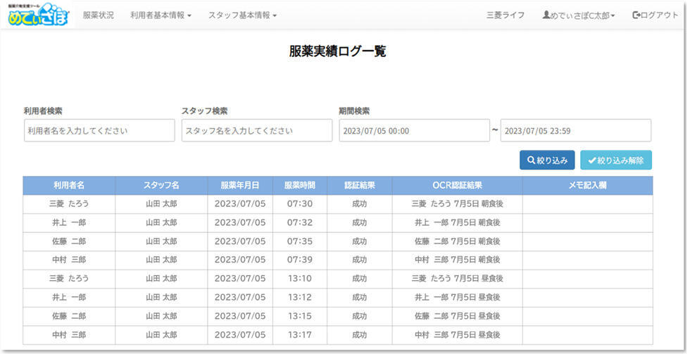 いつ、誰が、誰に、誰の薬を渡したかのログが残ります。また、薬の名前と顔認証した人が違うログも残り、ヒヤリハットの確認もできます。