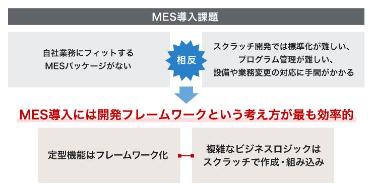 当社では、「自社業務に合わせたMESアプリケーションのスクラッチ開発」「標準化によるMESアプリケーション開発・管理の効率化」という相反するMESの導入課題に対して、「開発フレームワークの活用」が最も効率的であると考えました。