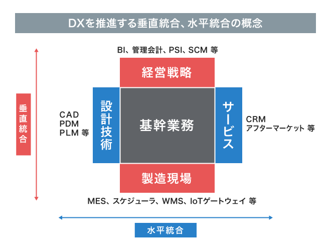 経営からMES/製造現場システムが連携した「垂直統合」による全体最適化や、CAD・PDM・PLMなど設計技術とERPとの連携や、製品納入後(アフターマーケット分野)の設備保全管理などのシステムが連携した「水平統合」など、お客様のデジタルトランスフォーメーション推進を支援します。