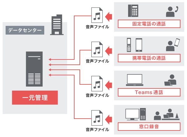 - 録音された通話内容は、音声ファイルとして真正性を確保したストレージにアーカイブし、必要な時に必要な場所から再生可能です。