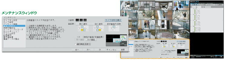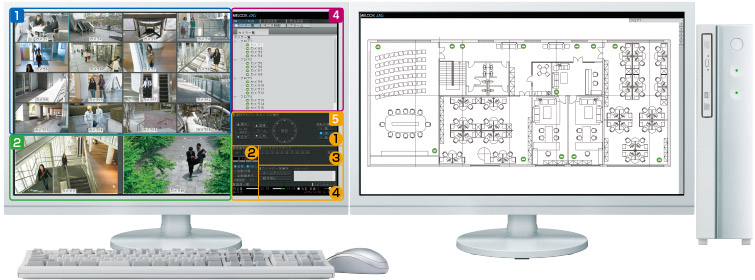 操作の容易さと作業効率を高めるためワイド画面を採用。監視に必要なカメラ映像(ライブ・再生)、カメラ配置図、カメラ一覧をひとつの画面で一元管理。見やすくわかりやすいGUIで操作性を大きく向上させています。