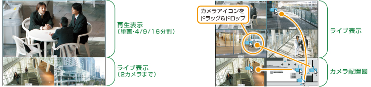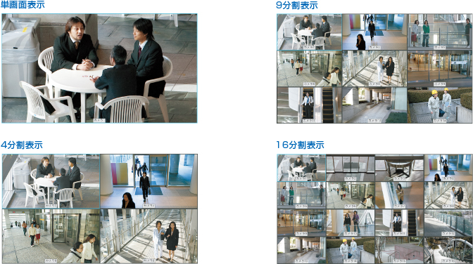 モニタリング中のライブ映像、または記録再生時には単画面から16分割まで切替が可能。アラーム発生時には4分割のライブ表示に切り替わるなど、監視効率の向上に役立ちます。