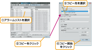 - ・アラームリストから簡単に記録映像のコピーも行えます。