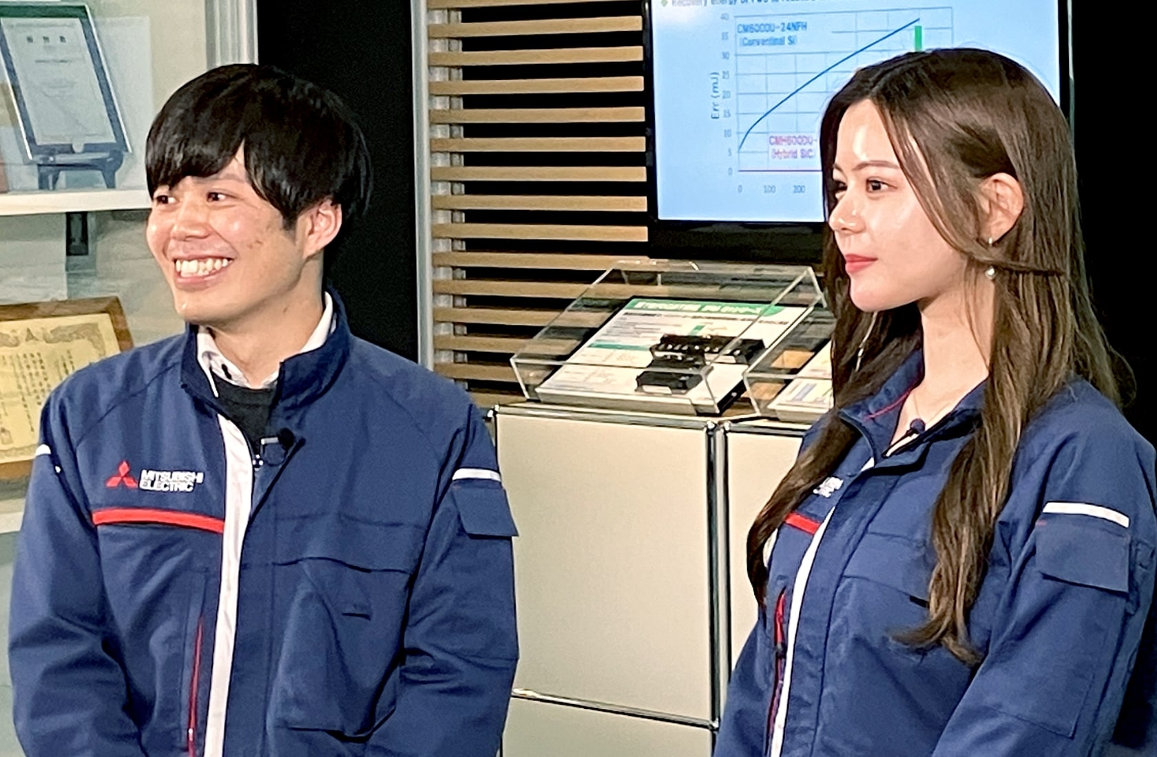 左から、パワーデバイス製作所 福岡事業所の商品戦略部の山本翔太さんと、パワーチップ設計部の井芹果奈さん