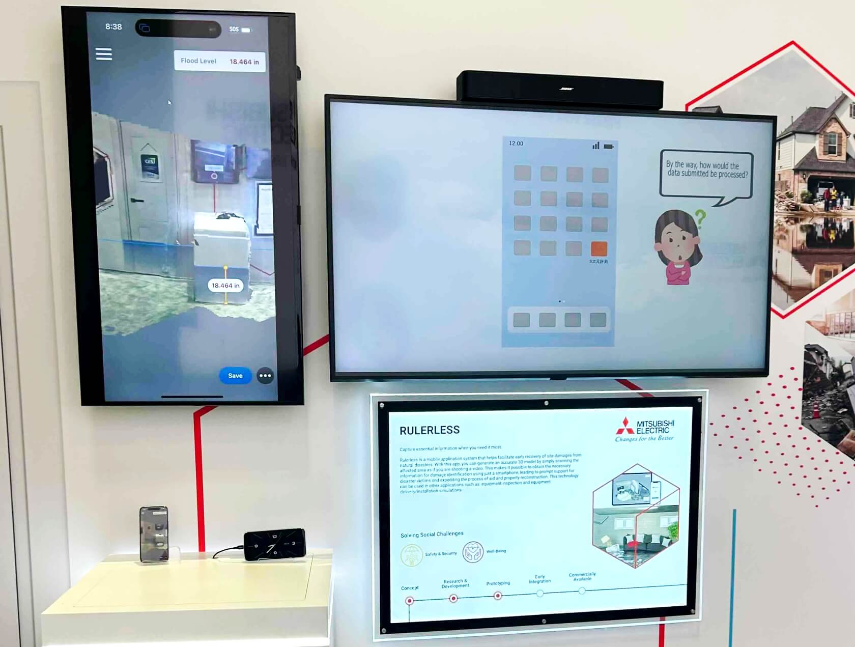 山本:一部のiPhoneシリーズに搭載されているLiDAR*を使った「Rulerless®」という3 次元計測アプリを展示しました。このアプリはもともと自然災害現場での活用を想定し開発され、その空間を3Dで認識して被害状況を正確かつ簡単に計測できることが特徴です。関心を持っていただいた来場者の方からもコメントや使い方をご提案いただいたことで、「Rulerless®」の可能性が広がったように感じます。