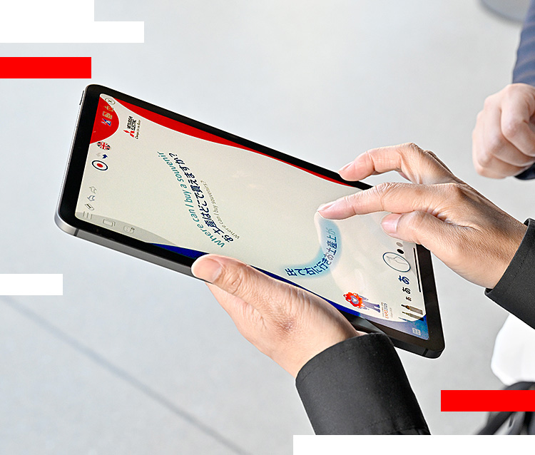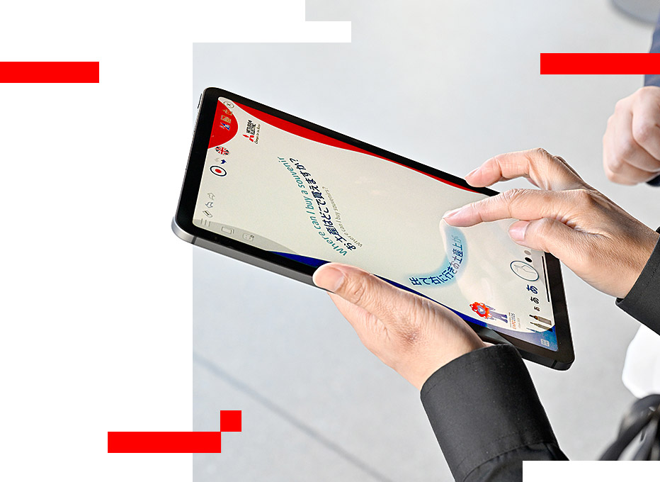 話した言葉を指でなぞった軌跡に表示する機能と多言語翻訳機能によって、聴覚障がいのある方や外国語話者の方とスムーズに会話できるアプリが、案内業務に役立てられています。
