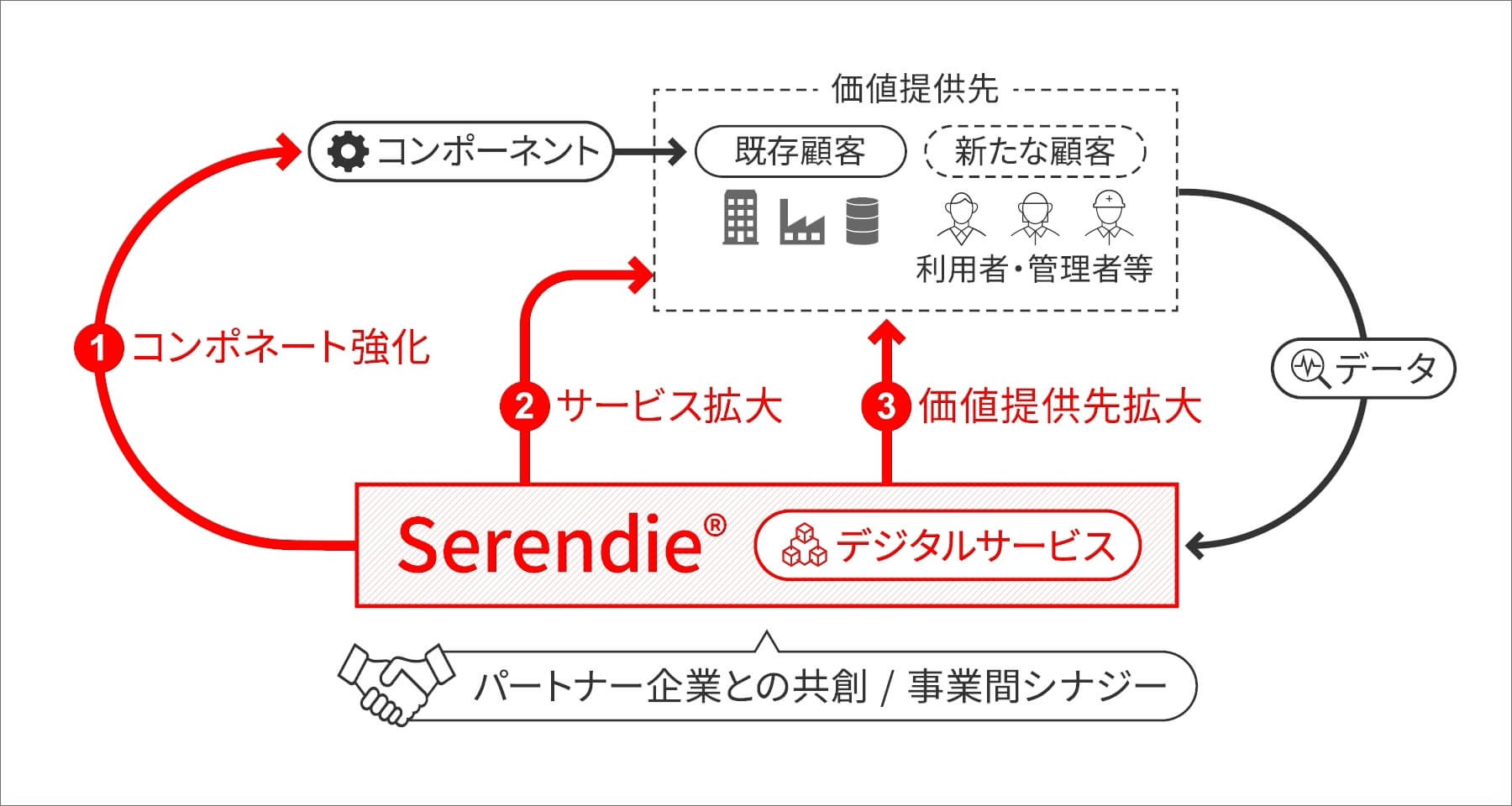 「ビジネスモデルの変革」の中核として紹介したのは、三菱電機の新たなデジタル基盤「Serendie®(セレンディ)」。漆間社長は「創業から多岐にわたる事業領域で制御機器などの開発に取り組んできたが、事業間でデータを共有する取り組みは進んでいなかった。セレンディでは各種コンポーネントやサービスから得られる豊富なデータを統合して分析し、顧客が抱える潜在的なニーズを把握して課題解決に向けた新しい価値を創出する取り組みだ。セレンディの活動で『新たなサービスの創出』『顧客の拡大』『コンポーネントの付加価値向上』の3つの変化が生まれている。2030年度までに関連事業の売上高を1.1兆円規模にする」と語った。