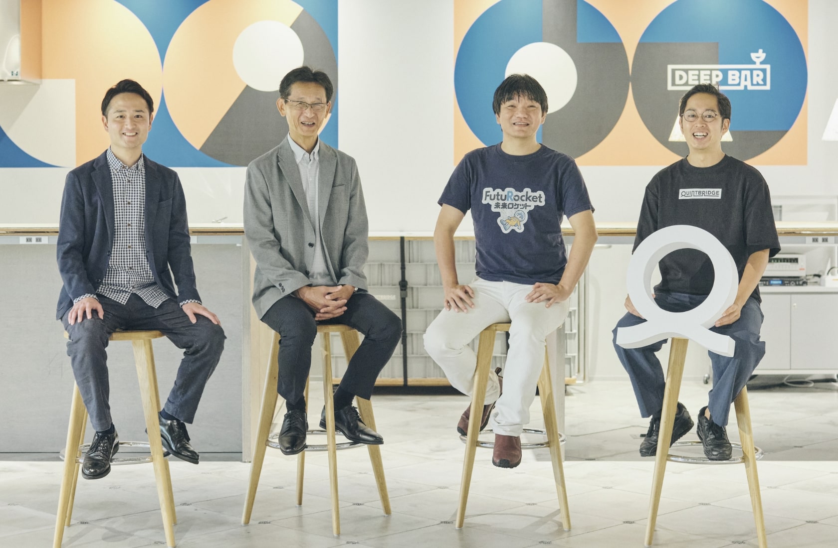 美谷さんが着用しているのはFutuRocketのロゴ入りTシャツ宮永さんが持っているのは「QUINTBRIDGE」のロゴマーク