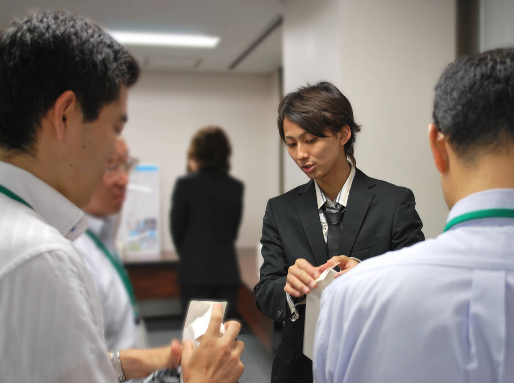 大学在学中に紙パックを活用して製作した作品のプレゼンテーションを行う藤ヶ谷さん