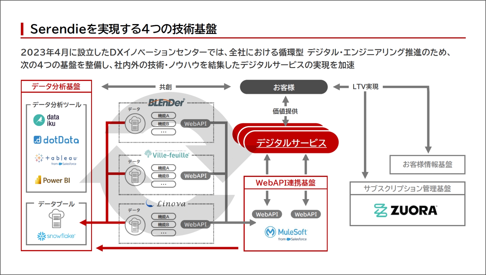各事業本部が循環型 デジタル・エンジニアリング企業を実現するために、それぞれが自前でツールを用意することもできるでしょう。ただ、それでは縦割り構造から脱却できません。そこでデータ集積や分析ツール、WebAPIを共通化したのが、「Serendie」最大の特徴です。