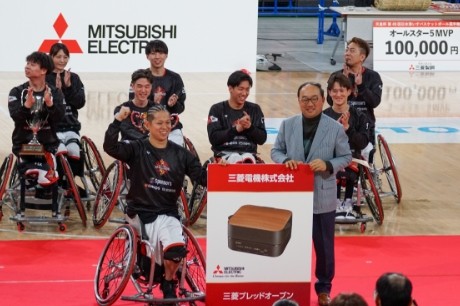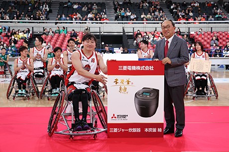 2月3日、4日に東京体育館で「天皇杯 第49回日本車いすバスケットボール選手権大会」が開催され、全国から勝ち上がった7チームと前回大会覇者の神奈川VANGUARDSの8チームがトーナメント形式で熱戦を繰り広げました。決勝戦は、「神奈川VANGUARDS」が「埼玉ライオンズ」を第4クオーターで逆転、47-44で勝利し、昨年に続く優勝を飾りました。表彰式では大会のスペシャルパートーナーである当社社長の漆間から副賞として「三菱ブレッドオーブン」を神奈川VANGUARDSの選手とスタッフ全員に計15台を贈りました。