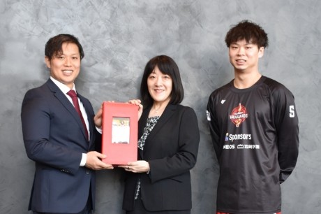 2月3日、4日に開催された「天皇杯 第49回日本車いすバスケットボール選手権大会」で優勝し、2年連続の栄冠を手にした「神奈川VANGUARDS」から、同大会でMVPに輝いた丸山弘毅選手と西村元樹選手が同大会のスペシャルパートナーである当社にご挨拶で来社されました。