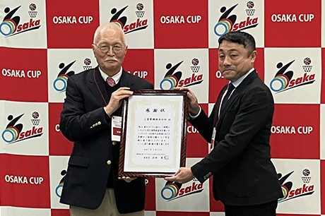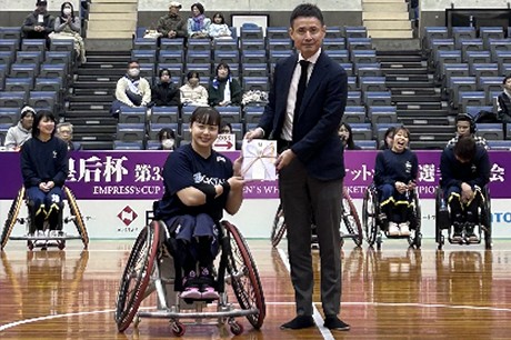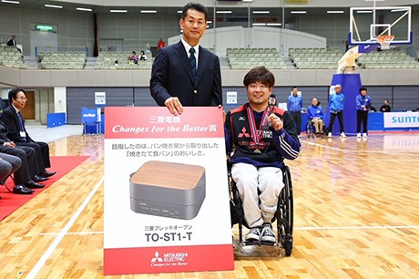 また、「第26回全日本ブロック選抜車いすバスケットボール選手権大会」も同時に開催され、 表彰式では今大会最も輝いた 川原凜 選手(関東ブロック)に「Changes for the Better 賞(三菱ブレッドオーブン)」を当社九州支社長の真釼から贈呈しました。