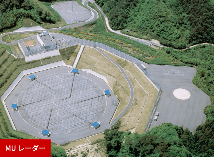 京都大学と共同開発し1984年に完成したアクティブ・フェーズドアレイ方式による大型大気レーダー「MUレーダー」は、475本のアンテナが直径約135mの円形に配置されています。全国の大学・研究機関の研究者へ解放され、超高層物理学、気象学、天文学、電気・電子工学、宇宙物理学など広範な分野に渡る多くの研究成果を生み出すなど、大気科学、レーダー技術の発展に大きく貢献し、「IEEEマイルストーン」にも認定されています。