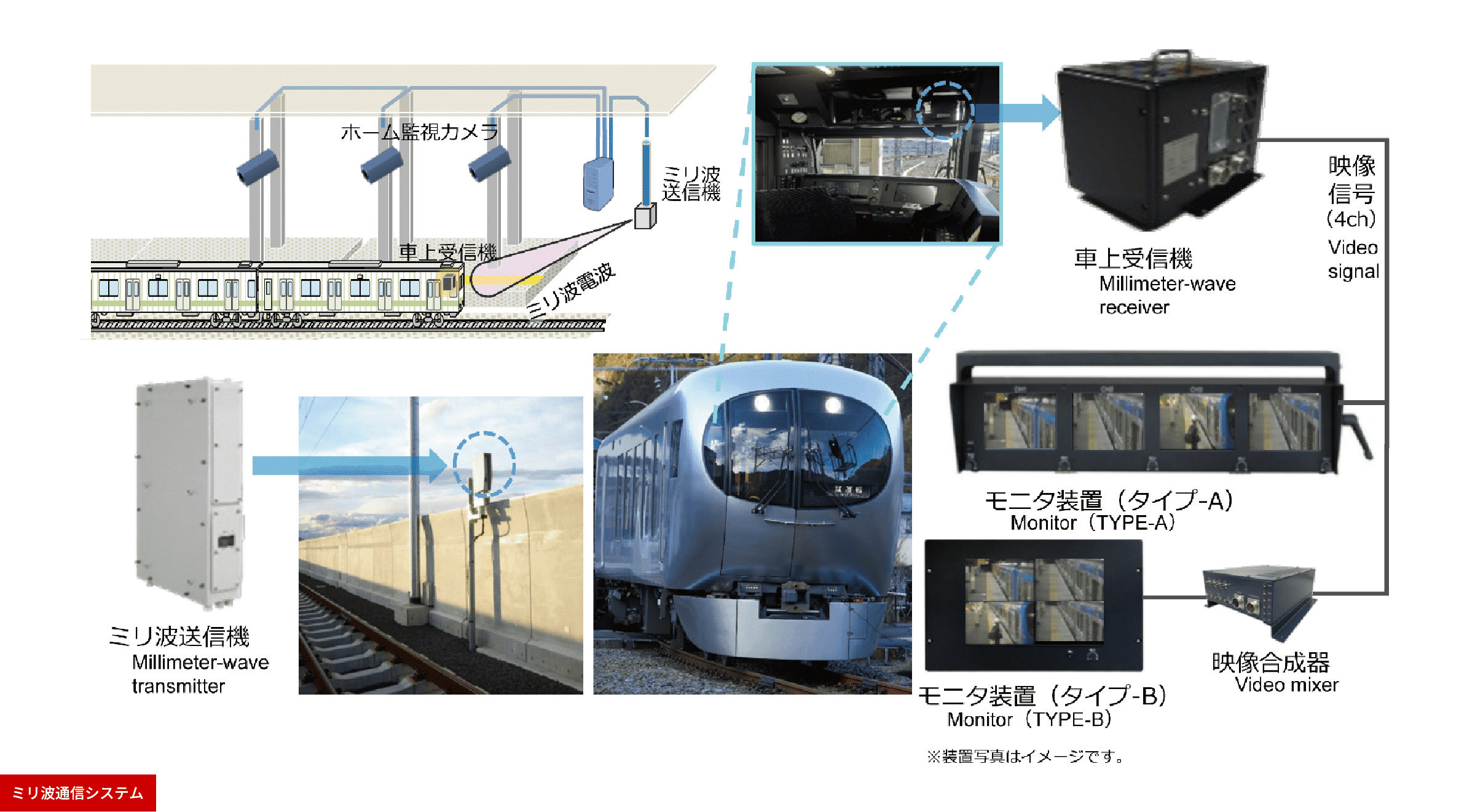 駅のホームカメラ映像を車両へ伝送し、運転手がリアルタイムで乗客の列車への乗り降り時の安全確認をできるように支援することで、より安全なワンマン運転を実現しています。また、映像コンテンツや駅・列車情報等の大容量データを、列車が駅に停車中の短時間で伝送するコンテンツ伝送システムは、乗客の快適・便利な列車利用に貢献しています。
